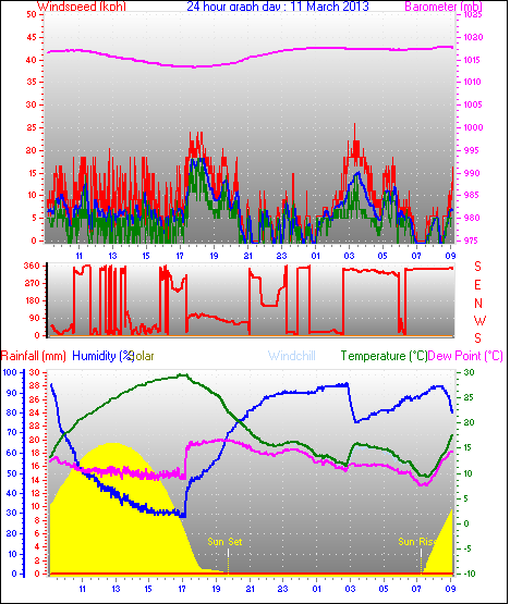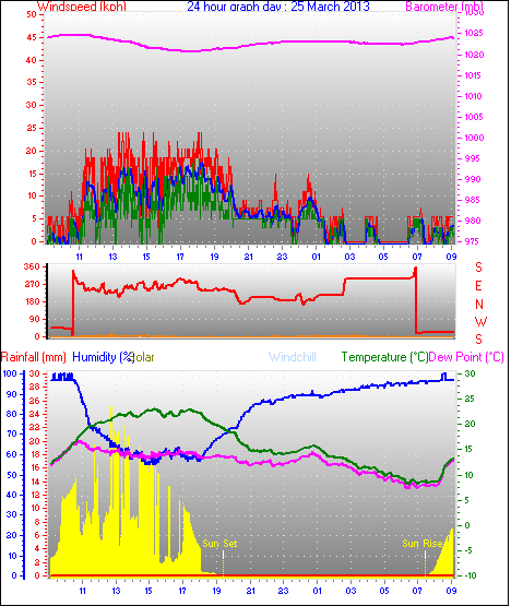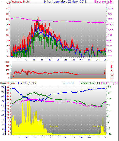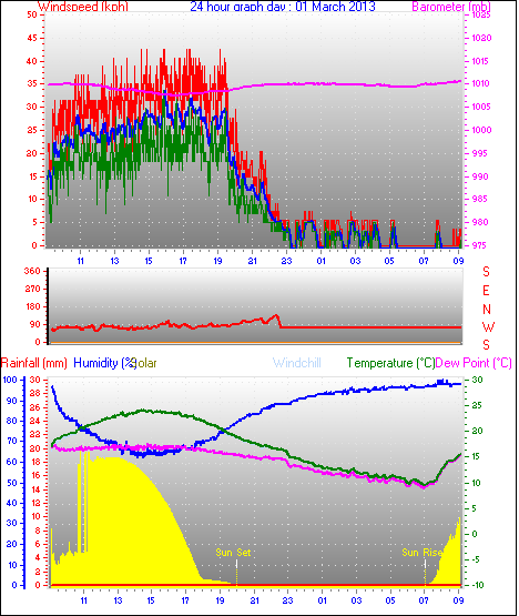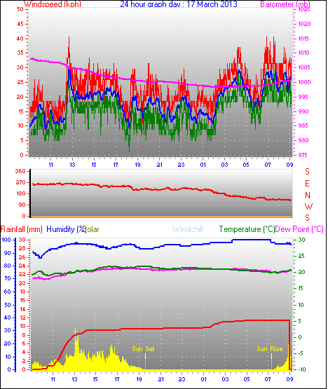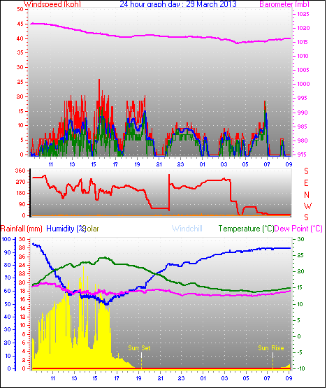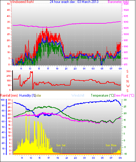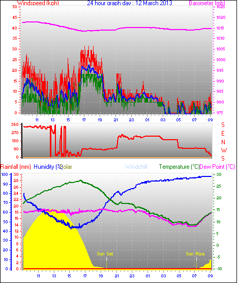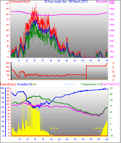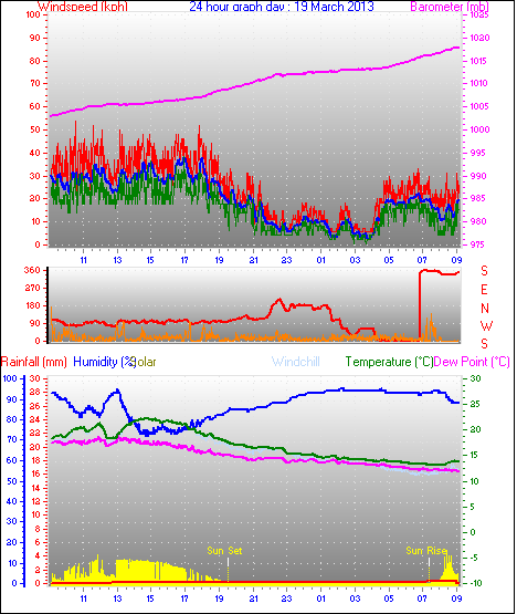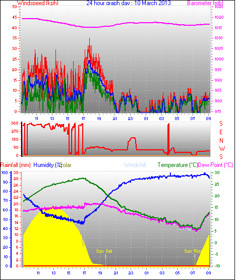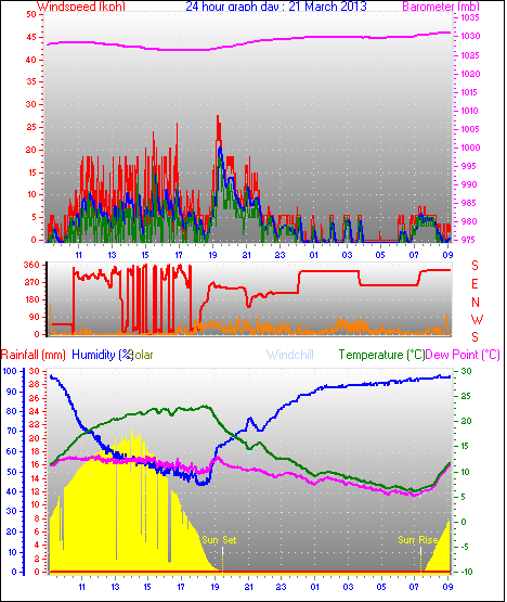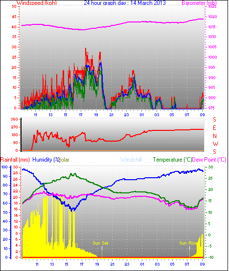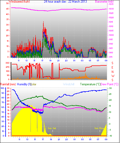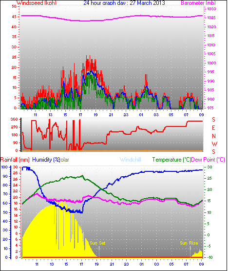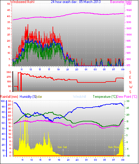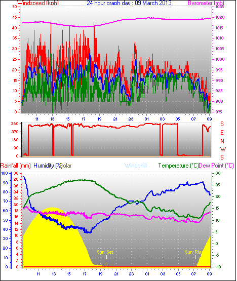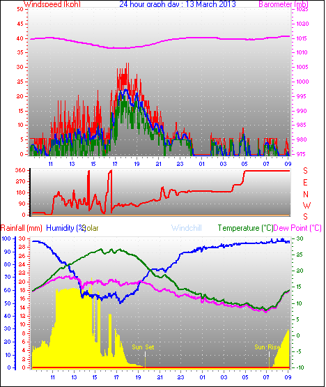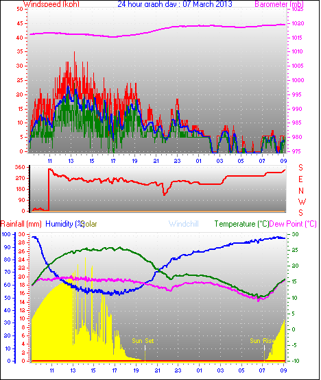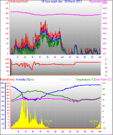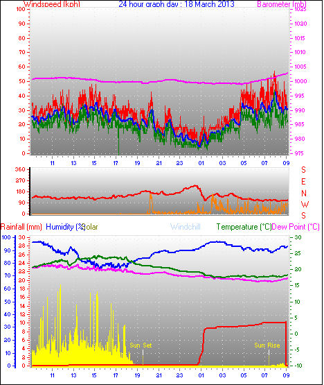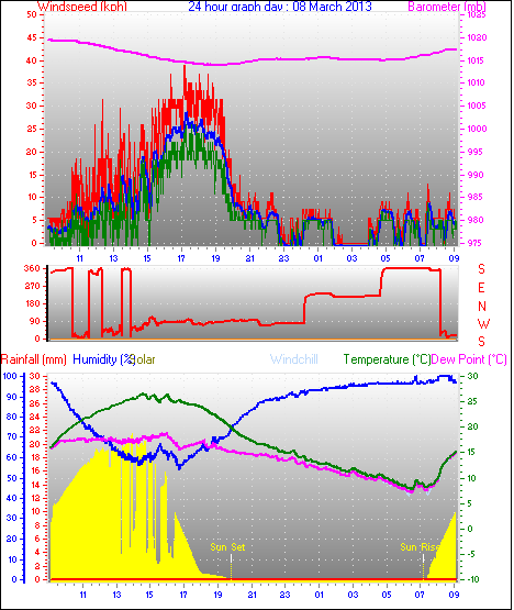 Maximum windspeed = 48.1 kmh from 293°(WNW) on day 18 at time 07:53